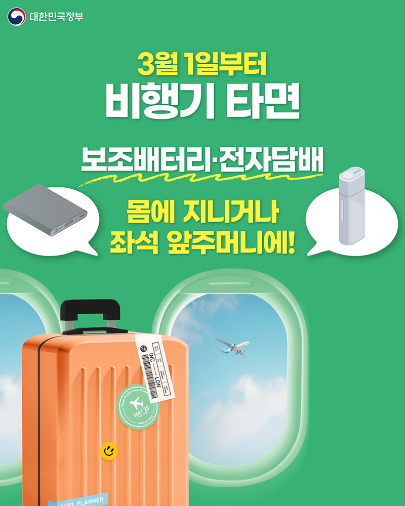 기존의 보조배터리와 전자담배의 수화물 위탁은 제한적이였으나, 3월 1일부로 규정 변경으로 인해 완전히 금지 됩니다. 이러한 규정 강화는 배터리의 과열 및 화재 위험을 줄이기 위한 조치로, 승객의 안전을 최우선으로 고려한 것이므로 반드시 승객분들은 보조배터리와 전자담배를 기내반입 해주셔야 합니다.