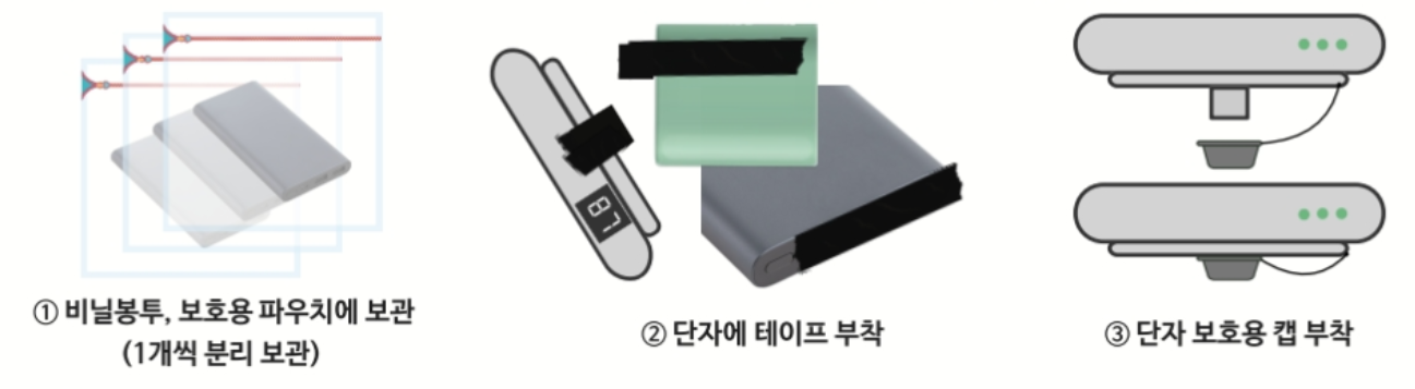 - 단자 부분에 절연 테이프를 부착하거나 보호용 파우치 또는 비닐봉투(ex.지퍼백)에 넣어 단락을 방지해야 합니다. (* 체크인카운터와 기내에 단락방지용 투명 비닐봉투를 비치하여 승객들이 필요 시 사용할 수 있도록 지원 예정)
