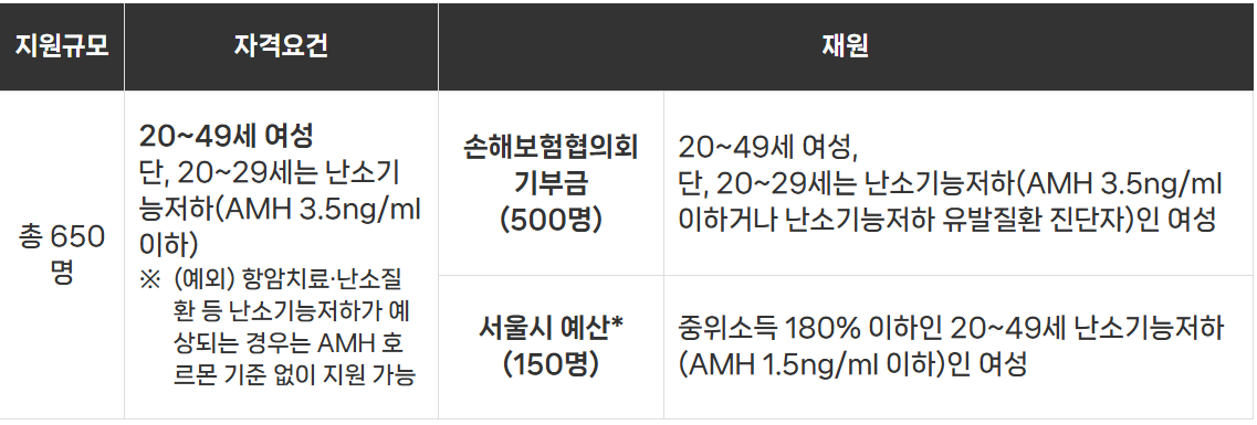 - 보관료, 입원료, 난자동결 이후 진료비 등 난자채취와 상관없는 비용은 지원 제외