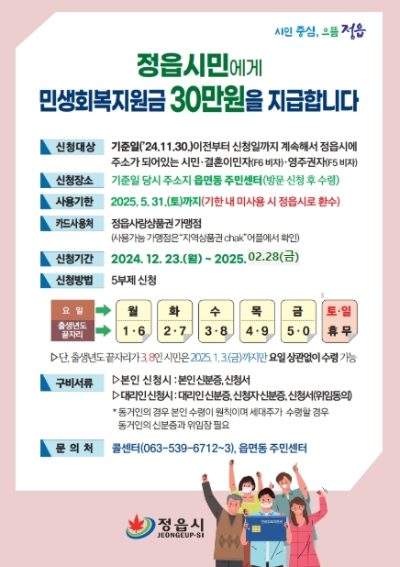 ✅ 기준일 (2024.11.30)이전부터 신청일까지 계속해서 정읍시에 주민등록이 되어 있는 모든 시민
