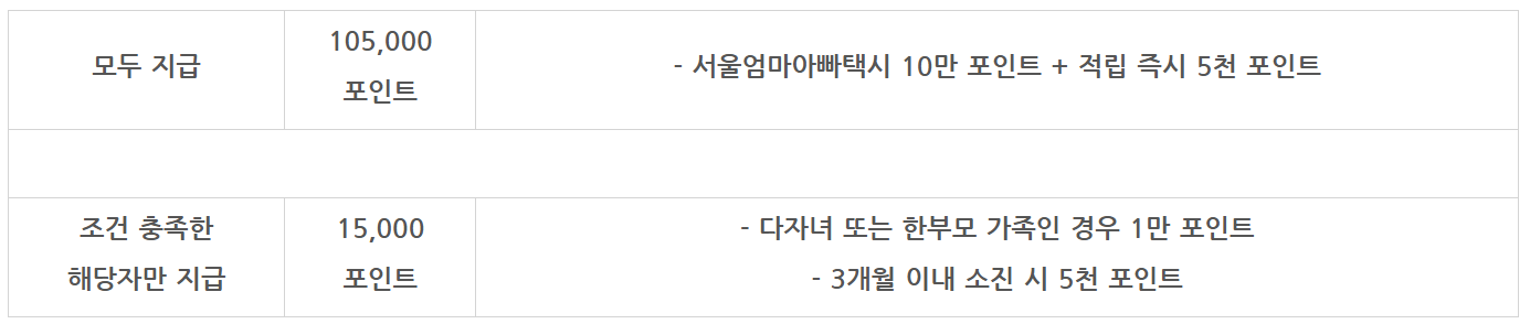 양육가정에게 더 많은 혜택을 주기 위해 서울시가 지원하는 10만원 택시 포인트와 별도로 운영업체에서 다자녀, 한부모 가족 포인트(1만원) 등 최대 2만원 추가 포인트를 지급함에 따라 최대 12만원 포인트까지 사용 가능합니다.