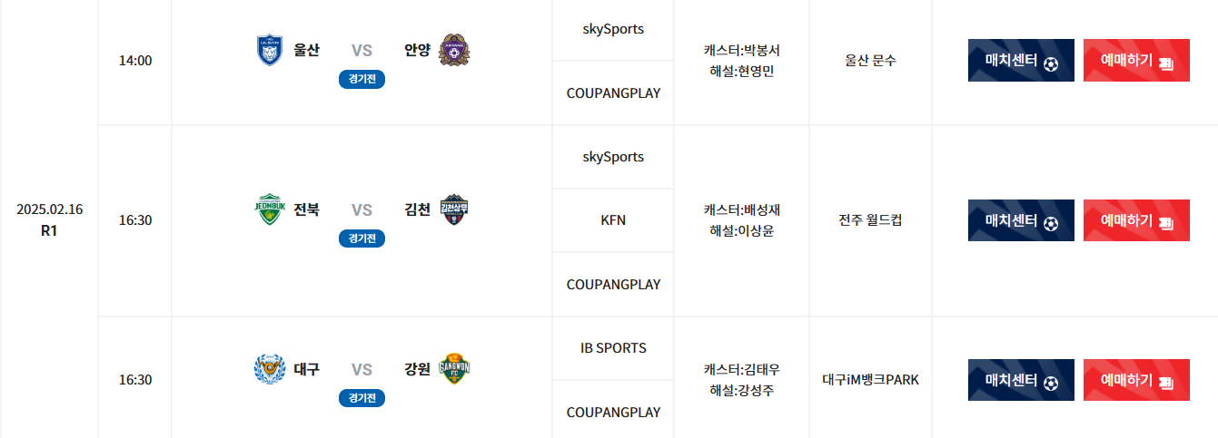 | 16:30 | 전북 vs 김천 | 전주월드컵경기장 |